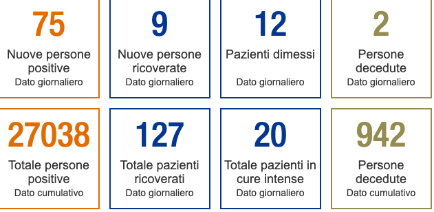 bollettino a livello cantonale –, la crescita è stata di 75 casi positivi e di 2 decessi in più. 127 (+9 da ieri) i pazienti attualmente ricoverati in ospedale, di cui 20 in terapia intensiva. 12 invece, i pazienti dimessi nelle ultime 24 ore.