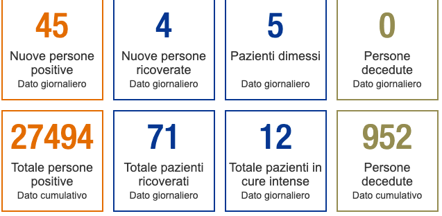 bollettino a livello cantonale –, la crescita è stata di 45 casi positivi e di zero decessi in più. 71 (+4 da ieri) i pazienti attualmente ricoverati in ospedale, di cui 12 in terapia intensiva. 5 invece, i pazienti dimessi nelle ultime 24 ore.