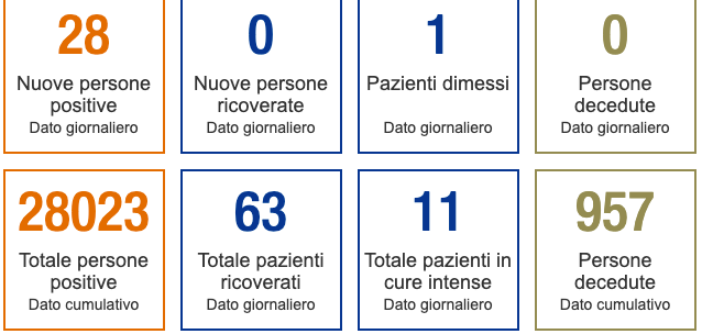 bollettino a livello cantonale –, la crescita è stata di 28 casi positivi e di zero decessi in più. 63 (+0 da ieri) i pazienti attualmente ricoverati in ospedale, di cui 11 in terapia intensiva. Un paziente è stato dimesso nelle ultime 24 ore.