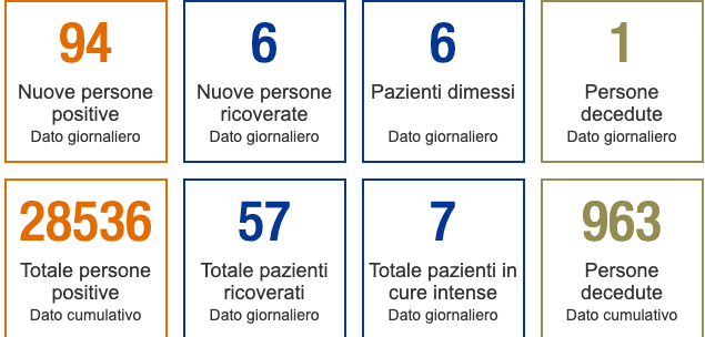 Il sito del Cantone ha appena fornito l’aggiornamento odierno dei dati sull’emergenza Coronavirus. Alle 8:00 di oggi, mercoledì 10 marzo, si contano 28'536 contagi dall’inizio dell’epidemia e 963 morti.