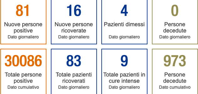 Il sito del Cantone ha appena fornito l’aggiornamento odierno dei dati sull’emergenza Coronavirus. Alle 8:00 di oggi, martedì 30 marzo, si contano 30'086 contagi dall’inizio dell’epidemia e 973 morti.