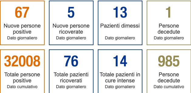 bollettino a livello cantonale –, la crescita è stata di 67 casi positivi e di un decesso in più. 76 (+5 da ieri) i pazienti attualmente ricoverati in ospedale, di cui 14 in terapia intensiva. Tredici, invece, i pazienti dimessi nelle ultime 24 ore.