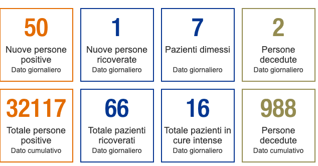 bollettino a livello cantonale –, la crescita è stata di 50 casi positivi e di due decessi in più. 66 (+1 da ieri) i pazienti attualmente ricoverati in ospedale, di cui 16 in terapia intensiva. 7, invece, i pazienti dimessi nelle ultime 24 ore.