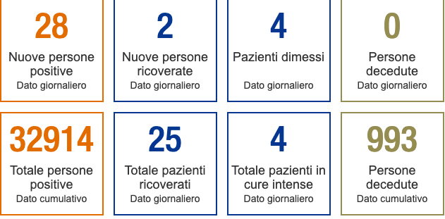 dell'ultimo bollettino a livello cantonale –, la crescita è stata di 28 casi positivi e di zero decessi in più. 25 (+2 da ieri) i pazienti attualmente ricoverati in ospedale, di cui quattro in terapia intensiva. Quattro pazienti, invece, sono stati dimessi nelle ultime 24 ore.