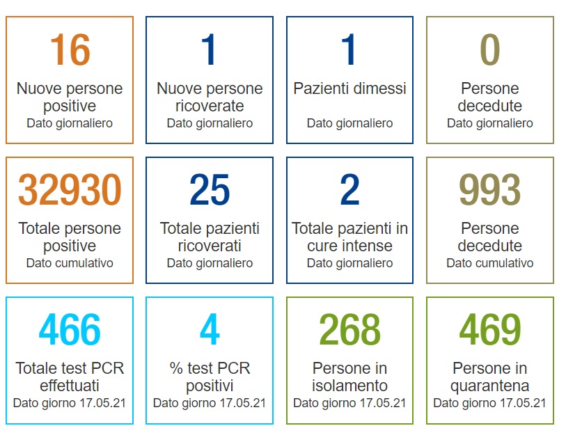 I casi tornano a scendere in Ticino. Se ne registrano 16 nelle ultime 24 ore, per un totale di positivi accertati da inizio pandemia di 32'930.