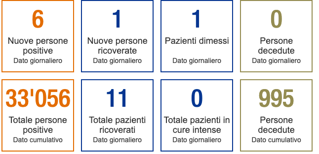 Il sito del Cantone ha appena fornito l’aggiornamento odierno dei dati sull’emergenza Coronavirus. Alle 8:00 di oggi, lunedì 31 maggio, si contano 33'056 contagi dall’inizio dell’epidemia e 995 morti. Rispetto a ieri – data dell'ultimo