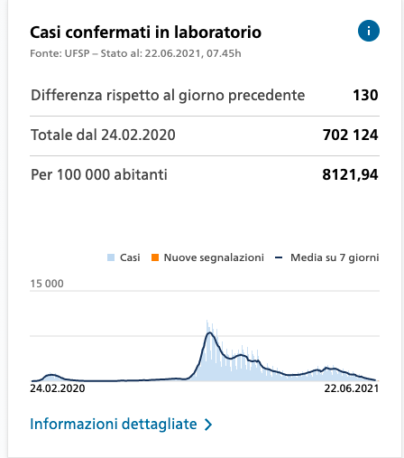 In Svizzera, nelle ultime 24 ore, sono stati registrati 130 nuovi contagi da coronavirus. Un dato – fa sapere l'Ufficio federale della sanità pubblica – che fa salire a quota 702'124 i casi totali. Rispetto a ieri