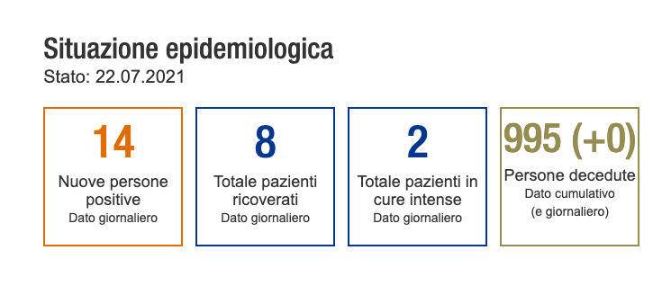 Il sito del Cantone ha appena fornito l’aggiornamento odierno dei dati sull’emergenza Coronavirus. Alle 8:00 di oggi, giovedì 22 luglio, si contano 33'614 contagi dall’inizio dell’epidemia e 995 morti.
