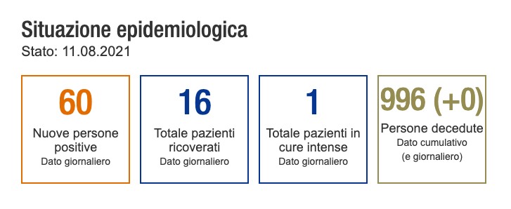 Il sito del Cantone ha appena fornito l’aggiornamento odierno dei dati sull’emergenza Coronavirus. Alle 8:00 di oggi, mercoledì 11 agosto, si contano 34'264 contagi dall’inizio dell’epidemia e 996 morti.
