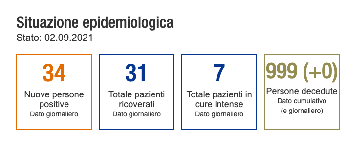 Il sito del Cantone ha appena fornito l’aggiornamento odierno dei dati sull’emergenza Coronavirus. Alle 8:00 di oggi, giovedì 2 settembre, si contano 35'399 contagi dall’inizio dell’epidemia e 999 morti.