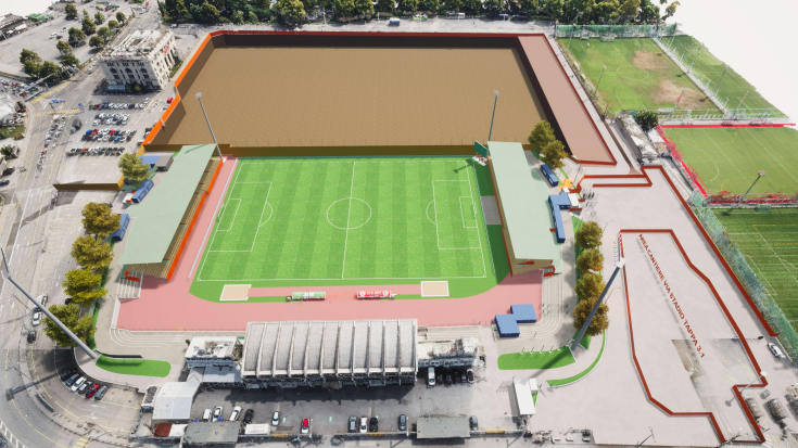 - la realizzazione dello stadio provvisorio, con la posa delle tribune provvisorie Nord e Sud, a partire da marzo. Lo stadio provvisorio entrerà in funzione il 7 luglio e avrà una capienza totale di 4'872 posti.
