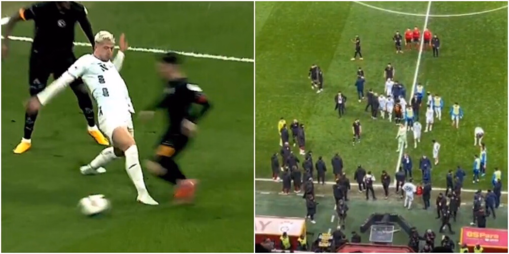 Con i padroni di casa in vantaggio per 1-0, grazie al rigore trasformato da Morata, al 25’ l’arbitro è caduto nel tranello dell’ex Napoli Dries Mertens che, lanciato verso la porta, si era lanciato a terra dopo un contatto inesistente con Semin Guler. Da lì sono partite le feroci proteste dei calciatori e della panchina dell’Adana, fino alla clamorosa decisione di abbandonare volontariamente il campo in segno di protesta, costringendo l’arbitro a sospendere il match. Per il Galatasaray si trattava del nono rigore a favore, in una stagione caratterizzata da delle decisioni arbitrali molto contestate dai rivali e in particolare da José Mourinho, manager del Fenerbahce.