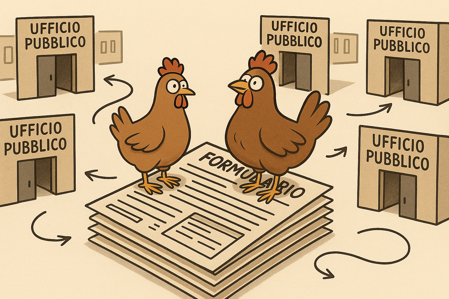 Nel passo citato, Tettamanti racconta un episodio tanto assurdo quanto realistico: un cittadino con due galline costretto ogni anno a compilare ogni anno un formulario di otto pagine. Il documento passa da un ufficio all’altro — dal Dipartimento cantonale delle finanze e dell’economia fino agli uffici federali dell’agricoltura, della statistica, dell’ambiente e perfino alla banca dati sul traffico di animali. Un groviglio kafkiano che, più che garantire il controllo, scoraggia chi lavora.
