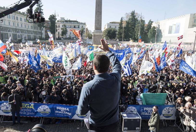 "Ce la metteremo tutta per far tornare l'Italia grande". Quando Matteo Salvini è salito sul palco della manifestazione della Lega "Io ci sono", in piazza del Popolo sono esplose le note del Nessun Dorma di Puccini e dalla folla leghista sono partiti i fumogeni bianco, rosso e verde del Tricolore italiano