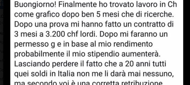 "Dopo una prova – scrive – mi hanno fatto un contratto di tre mesi a tremiladuecento franchi lordi. Dopo mi faranno un permesso G e in base al mio rendimento probabilmente il mio stipendio aumenterà. Lasciando perdere il fatto che a 20 anni tutti quei soldi in Italia non me li darà mai nessuno, secondo voi è una corretta retribuzione al di là di tutto?". Il contratto collettivo di lavoro Syndicom per le industrie grafiche prevede per chi non è qualificato un minimo di 3'800 franchi, per aumentare