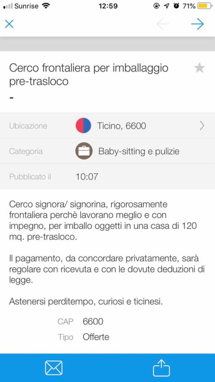 Porta il codice postale di Muralto, 6600, non ci sono ulteriori indicazioni. L’annuncio, riporta TicinoLibero, è finito su tutti.ch in cui si cercava una persona per dare una mano per imballaggio pre-tasloco è stata rimossa probabilmente per i troppi commenti ricevuti, non certo positivi.