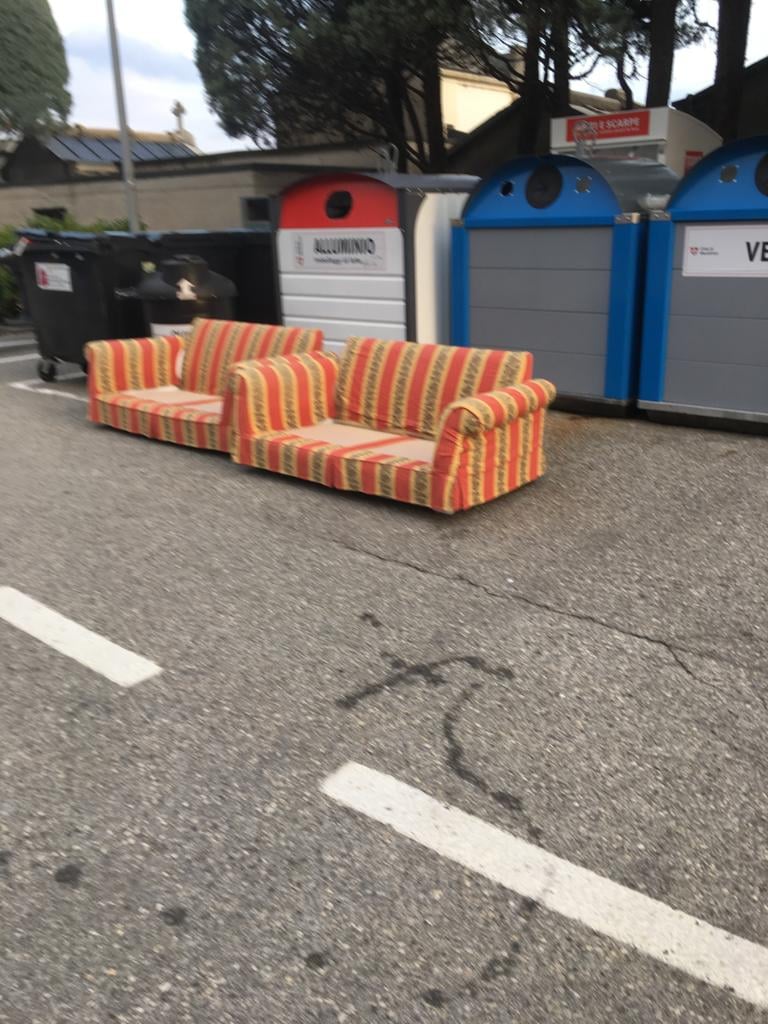 la foto che ha pubblicato sul suo profilo Facebook. Una foto che ha immortalato due divani a rigone giallorosse mollati senza ritegno di fronte a un punto di raccolta rifiuti. E al cimitero, per giunta.