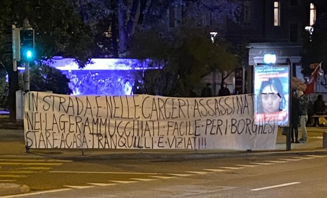 "In strada e nelle carceri assassinati, nei lager ammucchiati: facile per i borghesi stare a casa tranquilli e viziati". Sono frasi forti quelle scritte e gridate da un gruppo di manifestanti in piazza Molino Nuovo a Lugano.