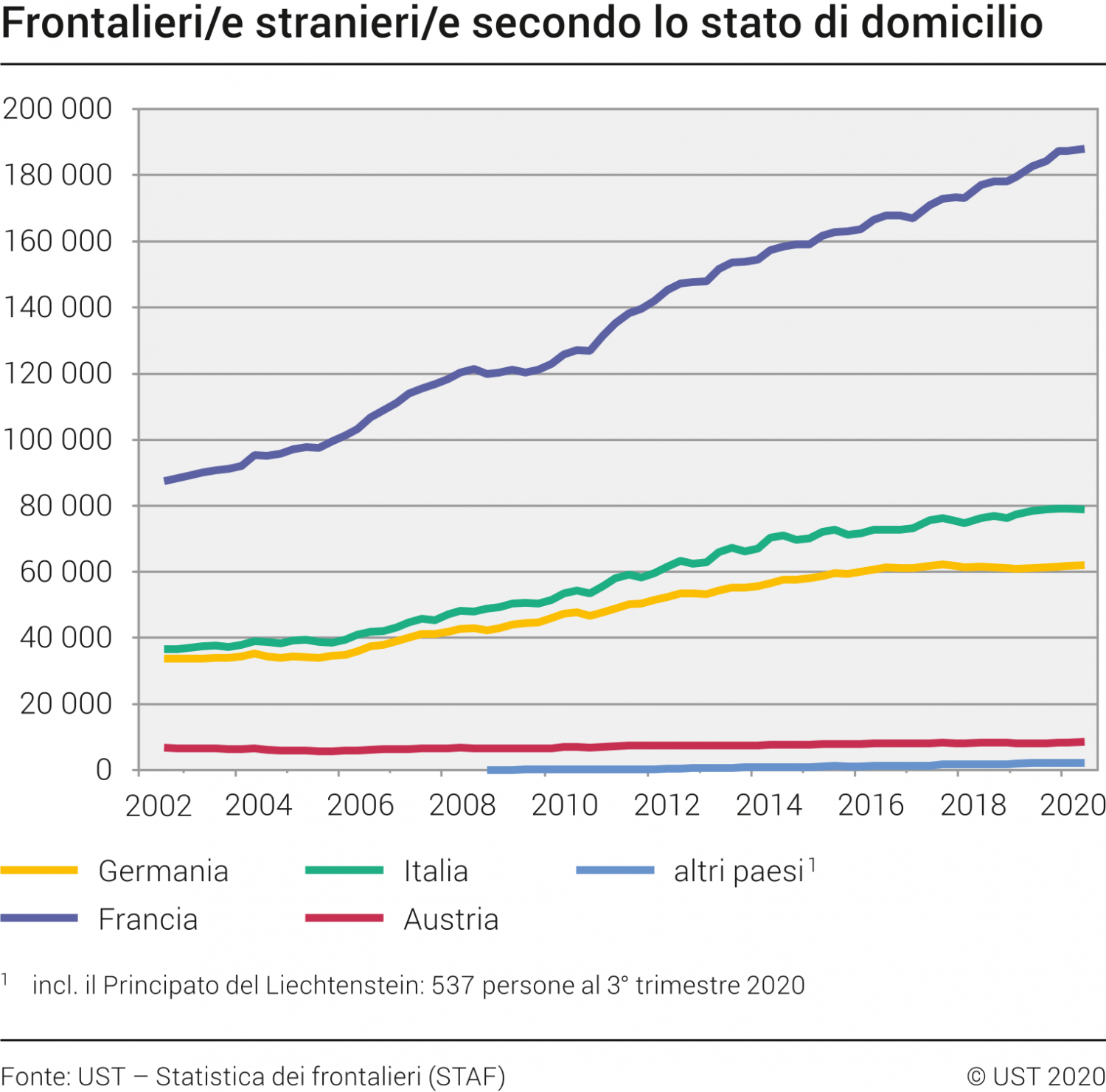 numero di frontalieri in tutta la Svizzera: sono – stando ai dati pubblicati oggi – 341mila, pari a una una crescita del 1,7% rispetto allo stesso periodo dell’anno scorso. Poco più della metà di tutti i frontalieri era domiciliata in Francia (55,0%), mentre il 23,5% e il 18,2% rispettivamente in Italia e in Germania.