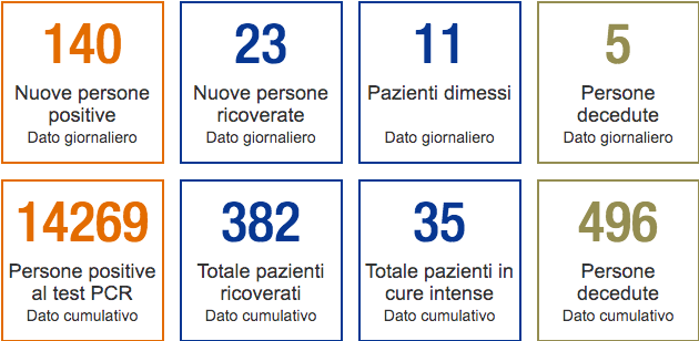 Il sito del Cantone ha appena fornito l’aggiornamento odierno dei dati sull’emergenza Coronavirus. Alle 8:00 di oggi, lunedì 23 novembre, si contano 14'269 contagi dall’inizio dell’epidemia e 496 morti.