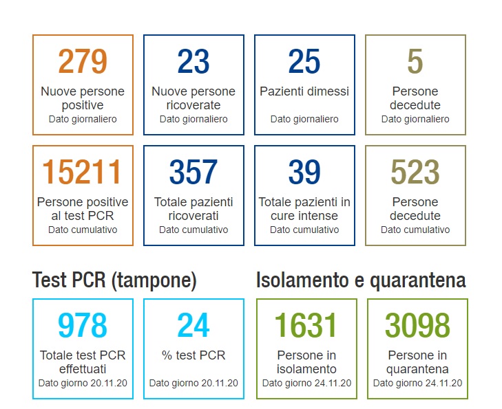 Arriviamo al venerdì ed ecco il dato più alto a livello di contagi di tutta la settimana in Ticino. Le nuove infezioni da Coronavirus sono 279, per un totale da inizio pandemia di 15'211.