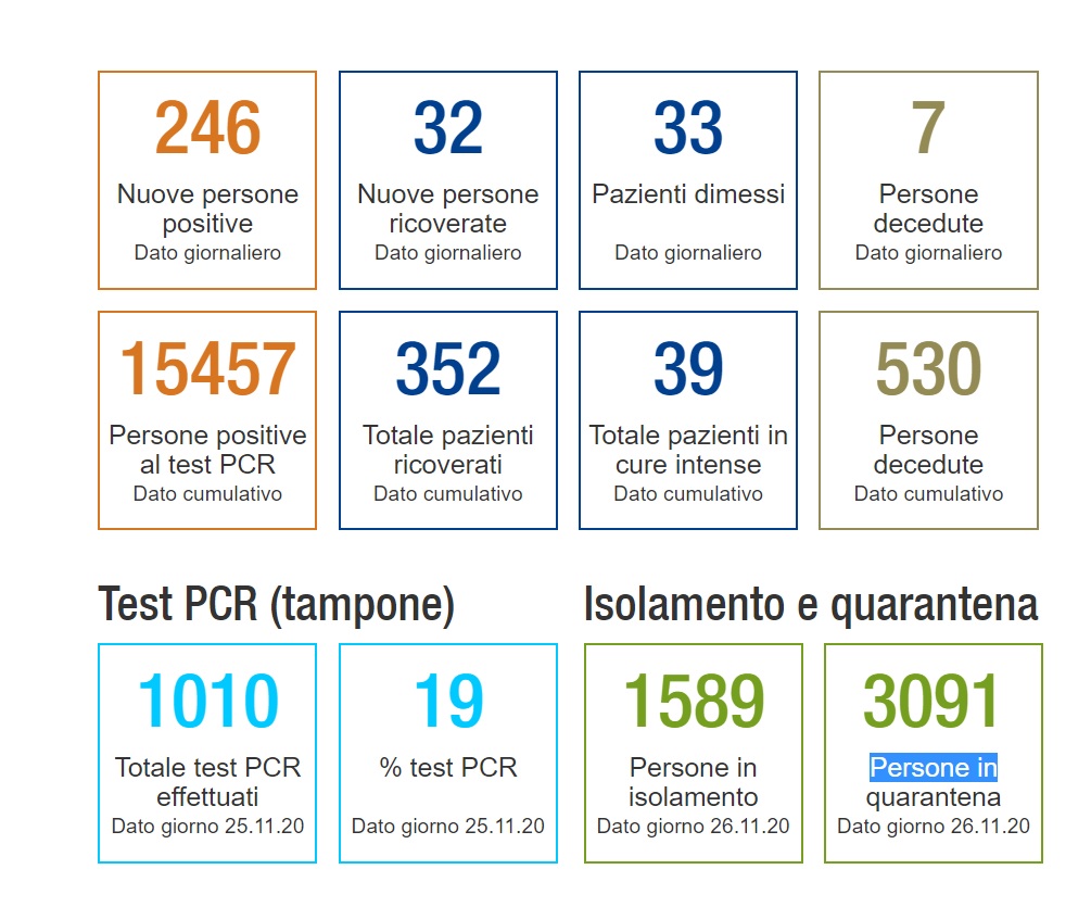 La situazione Covid in Ticino: 246 i contagi, 7 i decessi