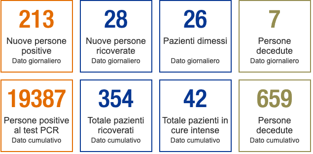 bollettino a livello cantonale –, la crescita è stata di 213 casi positivi e di 7 decessi in più. 354 (+28 da ieri) i pazienti attualmente ricoverati in ospedale, di cui 42 in terapia intensiva. 26, invece, i pazienti dimessi nelle ultime 24 ore.