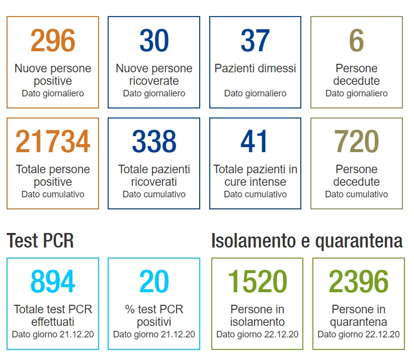 Ancora più contagi rispetto a ieri, sfiorano i 300, fermandosi a 296, in Ticino. La somma totale dei positivi accertati al Covid da inizio pandemia sale a 21'734.