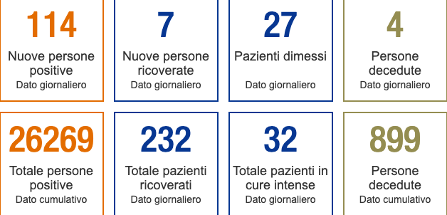 Il sito del Cantone ha appena fornito l’aggiornamento odierno dei dati sull’emergenza Coronavirus. Alle 8:00 di oggi, mercoledì 20 gennaio, si contano 26'269 contagi dall’inizio dell’epidemia e 899 morti. Rispetto a ieri – data dell'ultimo