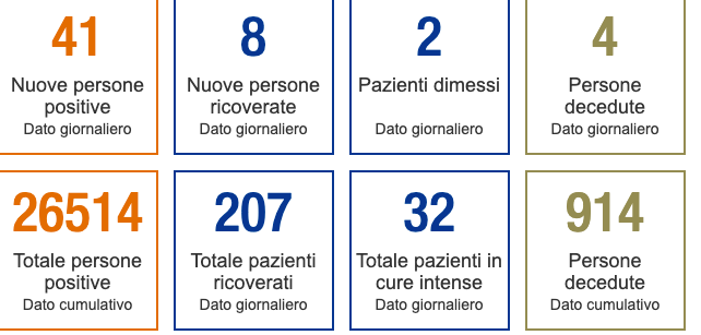 bollettino a livello cantonale –, la crescita è stata di 41 casi positivi e di 4 decessi in più. 207 (+8 da ieri) i pazienti attualmente ricoverati in ospedale, di cui 32 in terapia intensiva. 2 invece, i pazienti dimessi nelle ultime 24 ore.