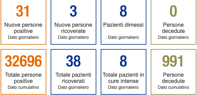 bollettino a livello cantonale –, la crescita è stata di 31 casi positivi e di zero decessi in più. 38 (+3 da ieri) i pazienti attualmente ricoverati in ospedale, di cui 8 in terapia intensiva. 8 invece, i pazienti dimessi dagli ospedali nelle ultime 24 ore.