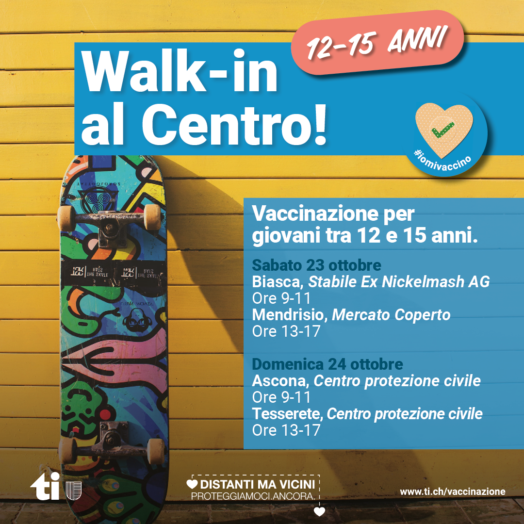 Il 23 e 24 ottobre 2021 ritorna il fine settimana dedicato ai giovani con un’età compresa tra i 12 e i 15 anni con la possibilità di vaccinarsi vicino a casa senza appuntamento («walk-in»). Come avvenuto all’inizio di ottobre, verranno aperti i centri cantonali di vaccinazione di Mendrisio e Biasca (sabato 23 ottobre), e di Tesserete e Ascona (domenica 24 ottobre). I giovani che non avevano approfittato di questa offerta avranno la possibilità di ricevere la prima dose di vaccino. Per la seconda dovranno successivamente recarsi al Centro cantonale di Giubiasco.