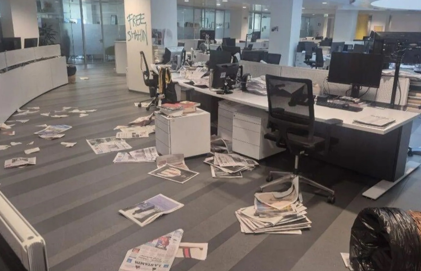 All’interno della sede del quotidiano sono state fatte scritte con vernice spray e del letame è stato lanciato contro i cancelli. Pile di giornali e di libri sono state buttate giù dalle scrivanie da manifestanti in parte a volto coperto, tra slogan quali “Giornalista terrorista, sei il primo della lista” e “Giornalista ti uccido”.