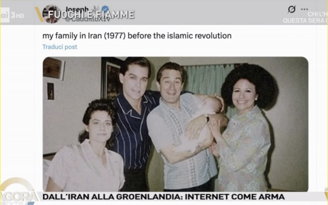 TV - Durante Agorà su Rai 3 viene mostrata un’immagine presentata come “famiglia iraniana prima della rivoluzione islamica”. Peccato che la foto non sia affatto un documento storico. Si tratta infatti di un fermo immagine del film Quei bravi ragazzi di Martin Scorsese, con Robert De Niro e Ray Liotta. Volti, ambientazione e abbigliamento coincidono perfettamente con una scena del film.